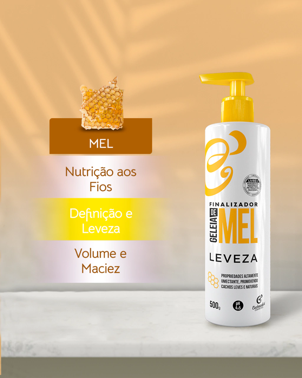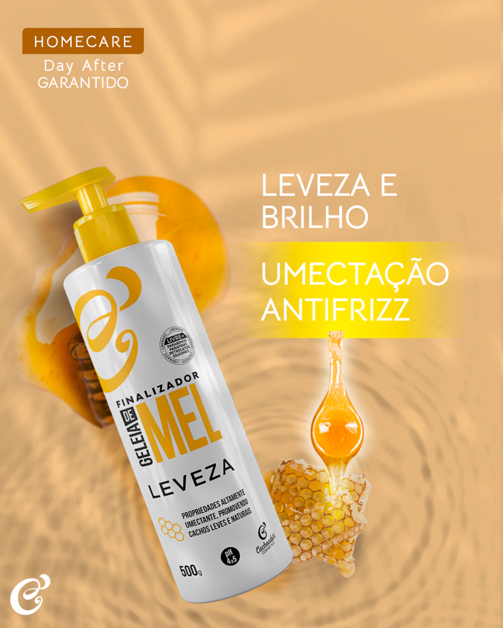 - Umectação: Rico em mel, promove uma umectação profunda, devolvendo água e nutrição aos fios.